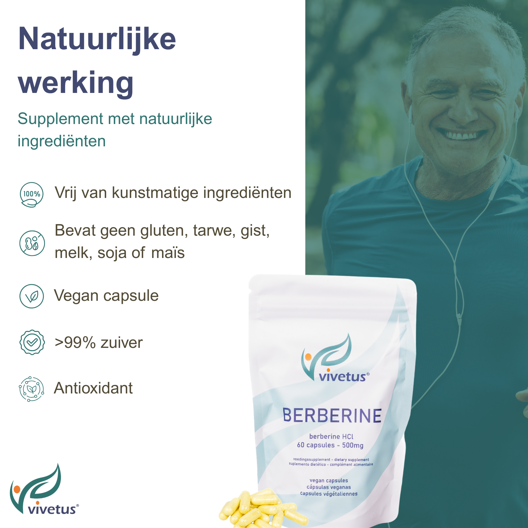 Berberine is een krachtig natuurlijk supplement dat helpt bij het ondersteunen van een gezonde bloedsuikerspiegel, cholesterolbalans en stofwisseling. Ideaal voor wie actief wil werken aan gezond ouder worden. Ontdek onze hoogwaardige, zuivere Berberine – zonder onnodige toevoegingen en met een gegarandeerde kwaliteit dankzij onafhankelijke labtesten.